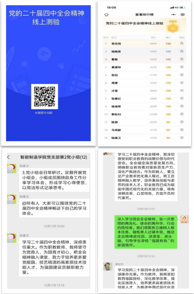 学院党支部以“三会一课”制度为基石,支委带头“研学”,党支部委员会率先垂范,组织专题学习会,聚焦“中国式现代化与职业教育使命”等核心议题,为谋划“十五五”发展提供了思想指引;党员大会“深学”,集中学习全会公报、《决定》及权威解读文章,并紧密结合学院产教融合、教学改革、学生管理等实际情况开展研讨;党小组会“促学”,围绕“全会精神感悟”“四中全会精神融入课堂教学”等贴近岗位的议题,推行“学习心得便签”,鼓励党员用简练语言即时记录思考火花,促进思想的碰撞与沉淀;以考促学“固学”,全体党员参与党的二十届四中全会精神线上专题测验,检验并巩固学习成果。